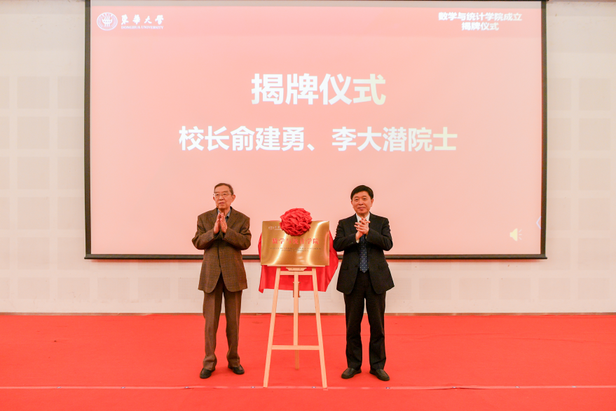 (俞建勇与李大潜共同为数学与统计学院成立揭牌)