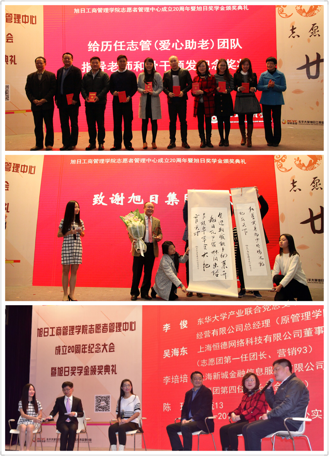 会上还进行了旭日奖学金颁奖典礼。今年是旭日奖学金设立的第14个年头,由香港旭日集团及杨勋先生设立暖流基金、旭日奖学金,对管院志愿者团队和品学兼优学生的激励和鼓舞。现场通过视频回顾了旭日奖学金的发展历史并展示了往届旭日奖学金获得者的风采。管院学子代表向香港旭日集团华东区副总经理冯庆崧先生献上致谢纪念奖杯和学生书法作品。
