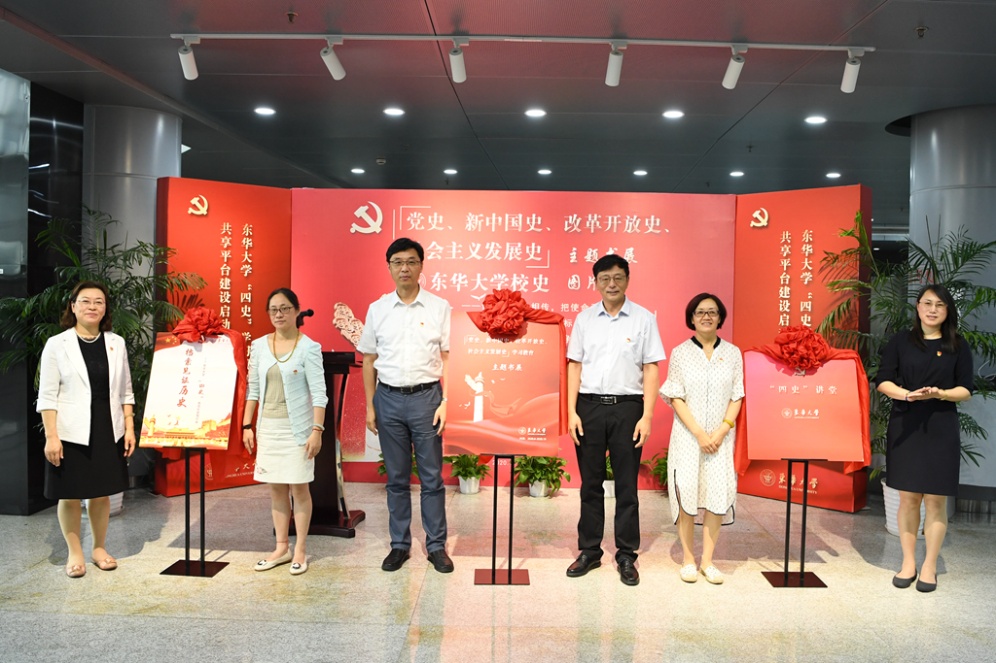 书非借亦可读也,读者轻点“瀑布流”屏上的“四史”书封,即可获得书籍简介,扫码进入线上阅览模式。《共产党宣言》《中国共产党代表大会史》等“四史”书籍集体“亮相”借阅大厅,校史老照片婉婉诉说着光阴里东华的故事,“四史”讲堂静待开讲……6月15日,一场“四史”学习教育的视听盛宴在松江校区图书馆拉开帷幕。党委书记刘承功,党委副书记刘淑慧、崔运花出席“四史”学习教育共享平台建设启动仪式,仪式由崔运花主持。