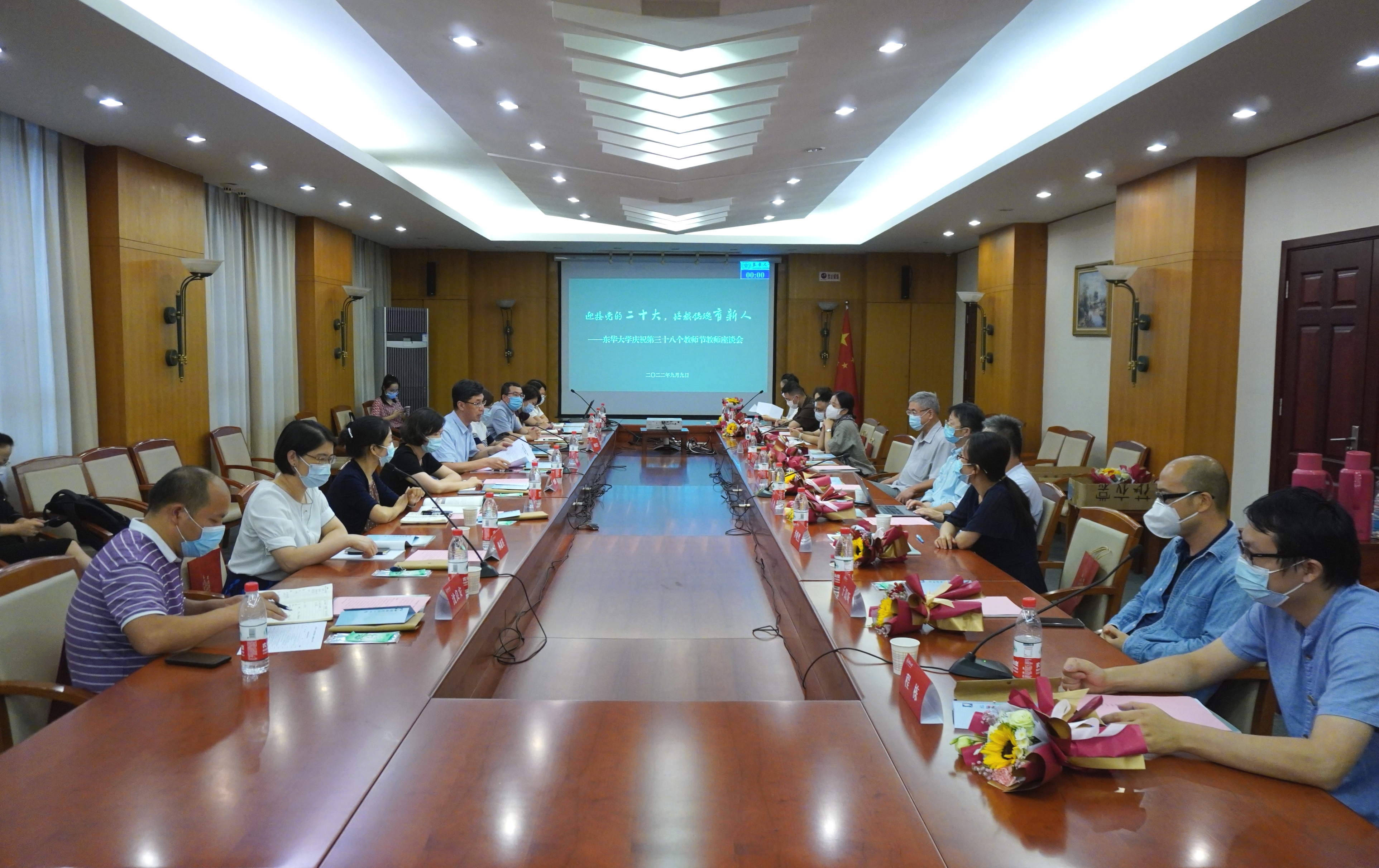 9月9日,在第三十八个教师节即将到来之际,学校以“迎接党的二十大  培根铸魂育新人”为主题,在两校区以线上线下的形式开展教师节慰问座谈活动。党委书记刘承功,校长俞建勇,党委副书记刘淑慧,副校长邱高、李炜出席活动,向全体教职工致以节日问候和诚挚敬意,相关学院部处负责人共同参加。刘淑慧、邱高分别在两校区主持活动。